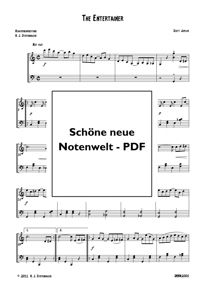 Der Entertainer ist sicherlich der bekannteste von Scott Joplins Ragtimes, nicht zuletzt durch seine Verwendung in Ganovenkomödie "Der Clou" (1973) mit Robert Redford und Paul Newman. Die vorliegende Bearbeitung ist leicht spielbar und klangvoll. Sie finden hier in der Schönen neuen Notenwelt auch eine Bearbeitung für zwei Saxophone.